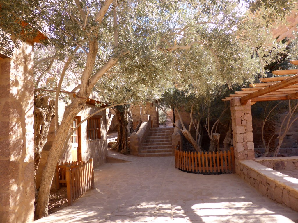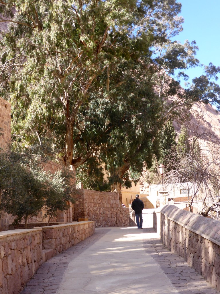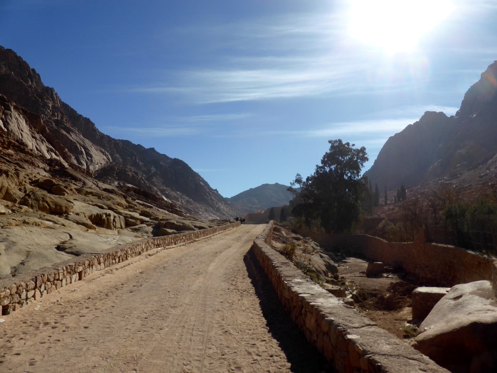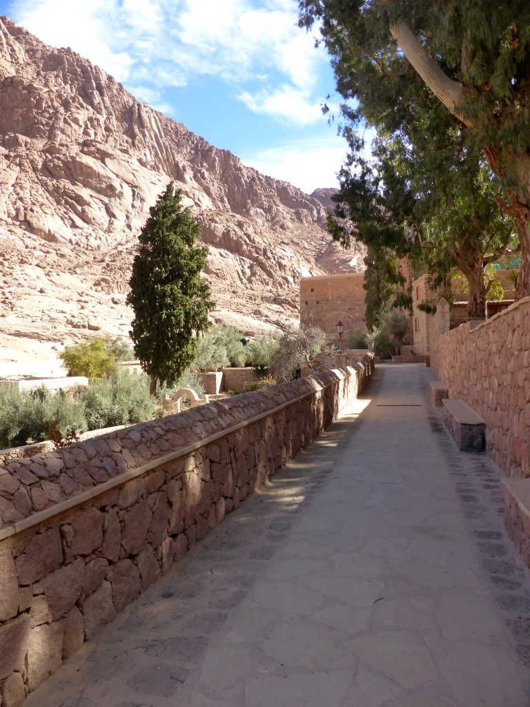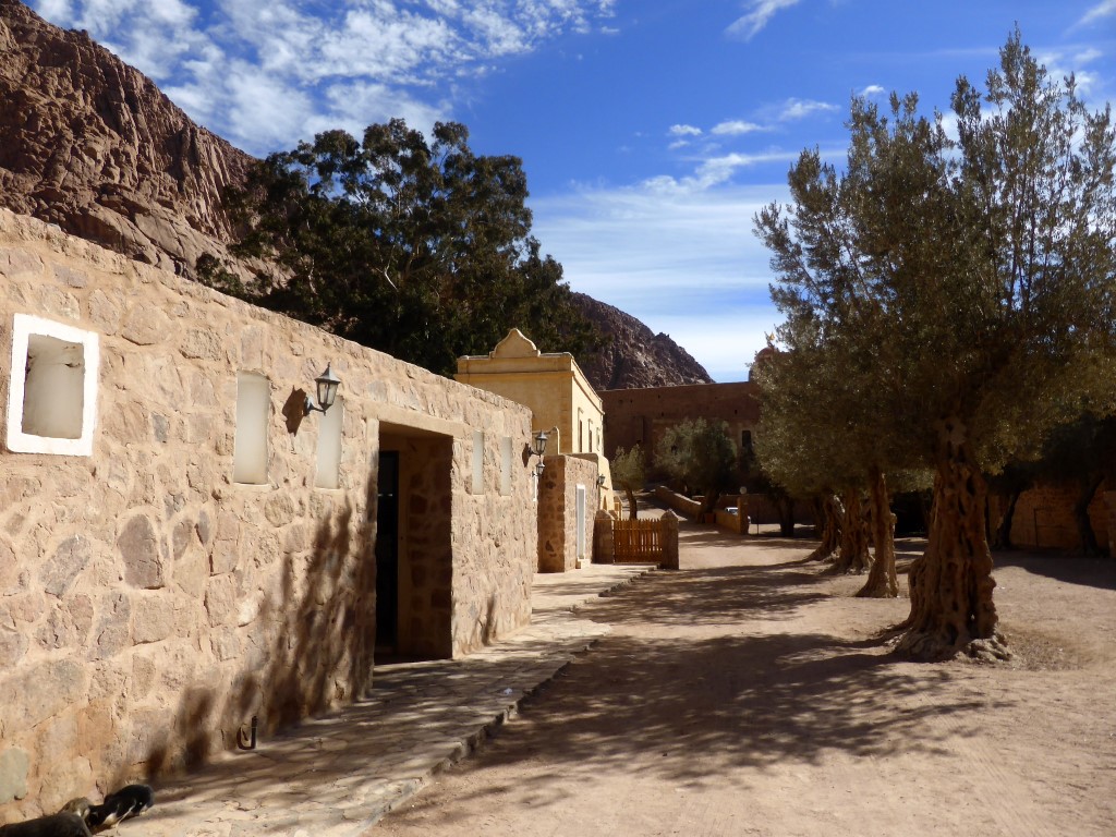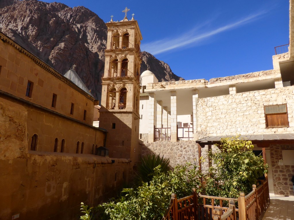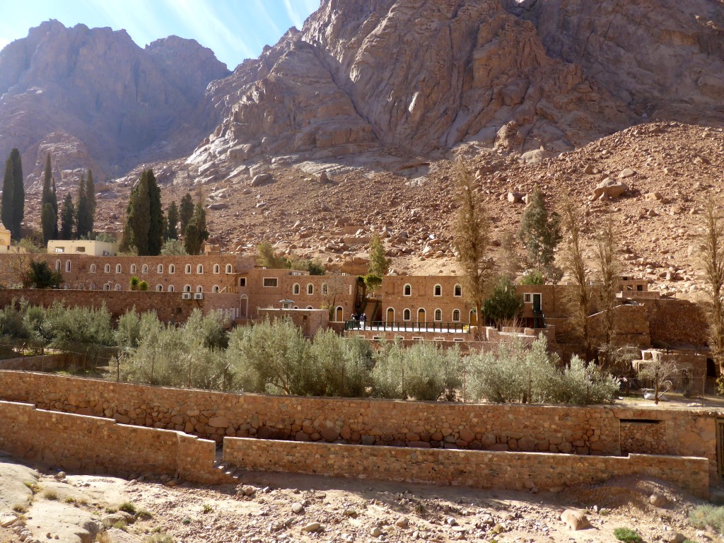 Von Dahab aus, fährt man ca. 110 km und unzähligen Polizeikontrollen, durch eine magisch schöne, unwirtliche Landschaft des Sinais, bis auf eine Höhe von 1585 m über dem Meeresspiegel. Vom früheren touristischen Massenansturm ist nicht mehr viel zu spüren, nur noch wenige Besucher finden den Weg hier her. Nach einem kurzen Fußweg vom Parkplatz aus, erreicht man die Anlage. Zwischen den hohen, steilaufsteigenden Bergen, erscheint das Kloster eher wie eine kleine Trutzburg. Nicht weit entfernt, kann man schon den Moses-Berg sehen. Das Kloster wurde zwischen 548 und 565 n. Chr. gegründet und ist das älteste immer noch bewohne Kloster des Christentums. Es liegt am Fuße des Berg Sinai (Moses-Berg), dort soll sich der Überlieferung nach der brennende Dornenbusch befunden haben (außerhalb der Kirche wächst ein Ginsterstrauch, ein Sprössling des ursprünglichen Strauchs), in dem sich Gott Moses offenbarte, sowie der Mosesbrunnen. Hier soll Moses die Schafe seines Schwiegervaters Jethro geweidet haben.