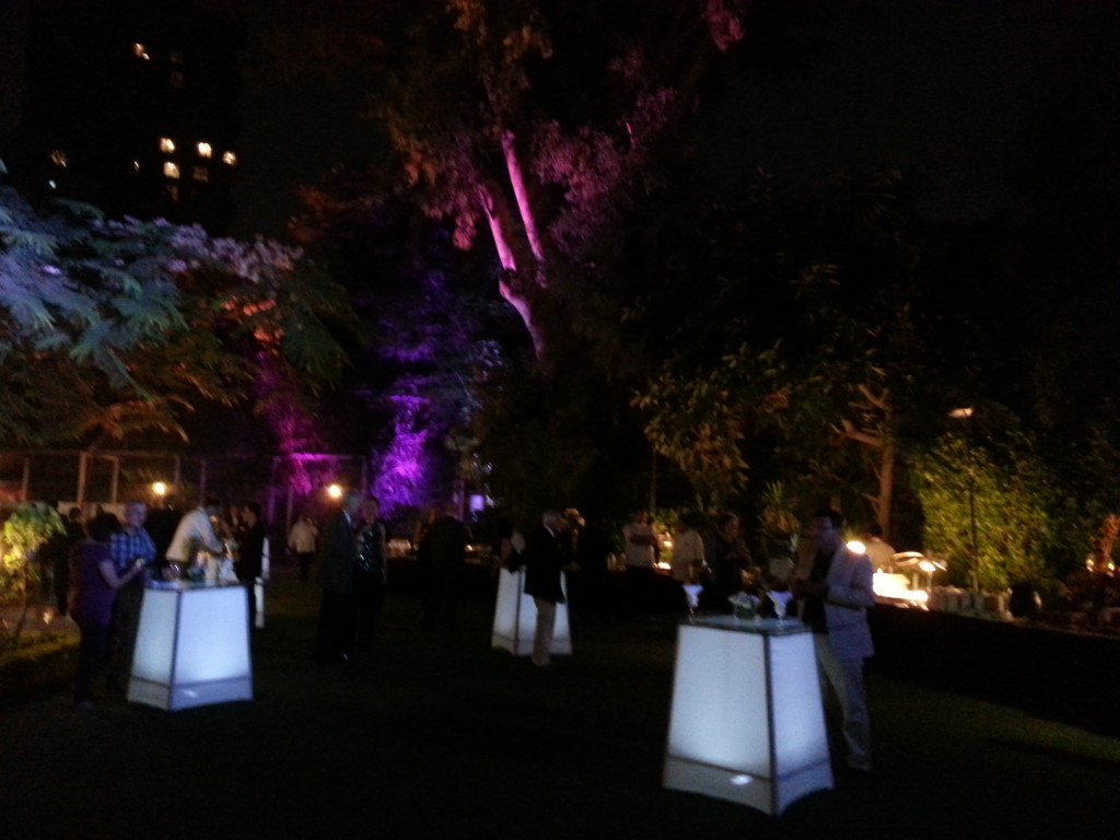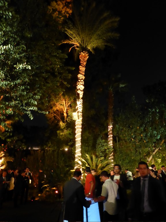 Im Ausland hingegen ist der 3. Oktober ein Ereignis. Die Deutsche Botschaft lädt zu einem Empfang ein. Man macht sich also schick, fährt (wir mit dem Zug – das wird aber ein anderer Bericht) nach Kairo und wird dann am Abend am Eingang vom Botschaftsgarten durch den Botschafter, seiner Frau, dem stv. Botschafter und dessen Frau, sowie dem Militärattaché begrüßt. Anschließend geht es in den sehr geschmackvoll geschmückten und beleuchteten Garten. Livrierte Menschen reichen einem Kaltgetränke aller Art und im Hintergrund läuft neben der Lounge Musik auch eine Lichtshow, die Bilder vom geteilten Deutschland zeigen. Wirklich gut gemacht.