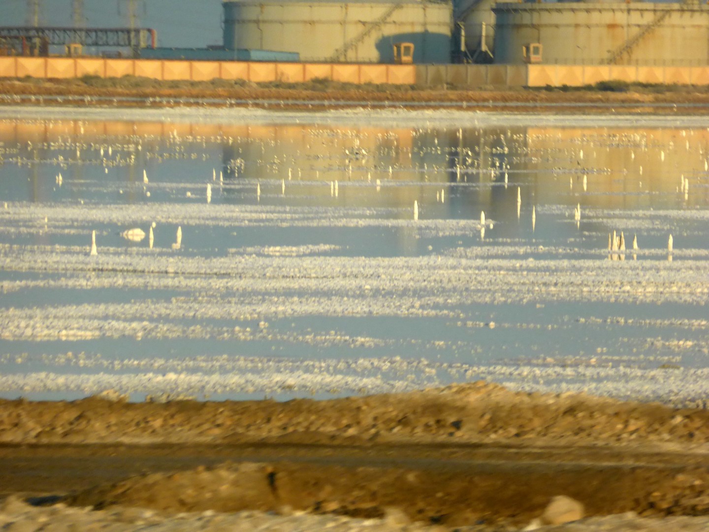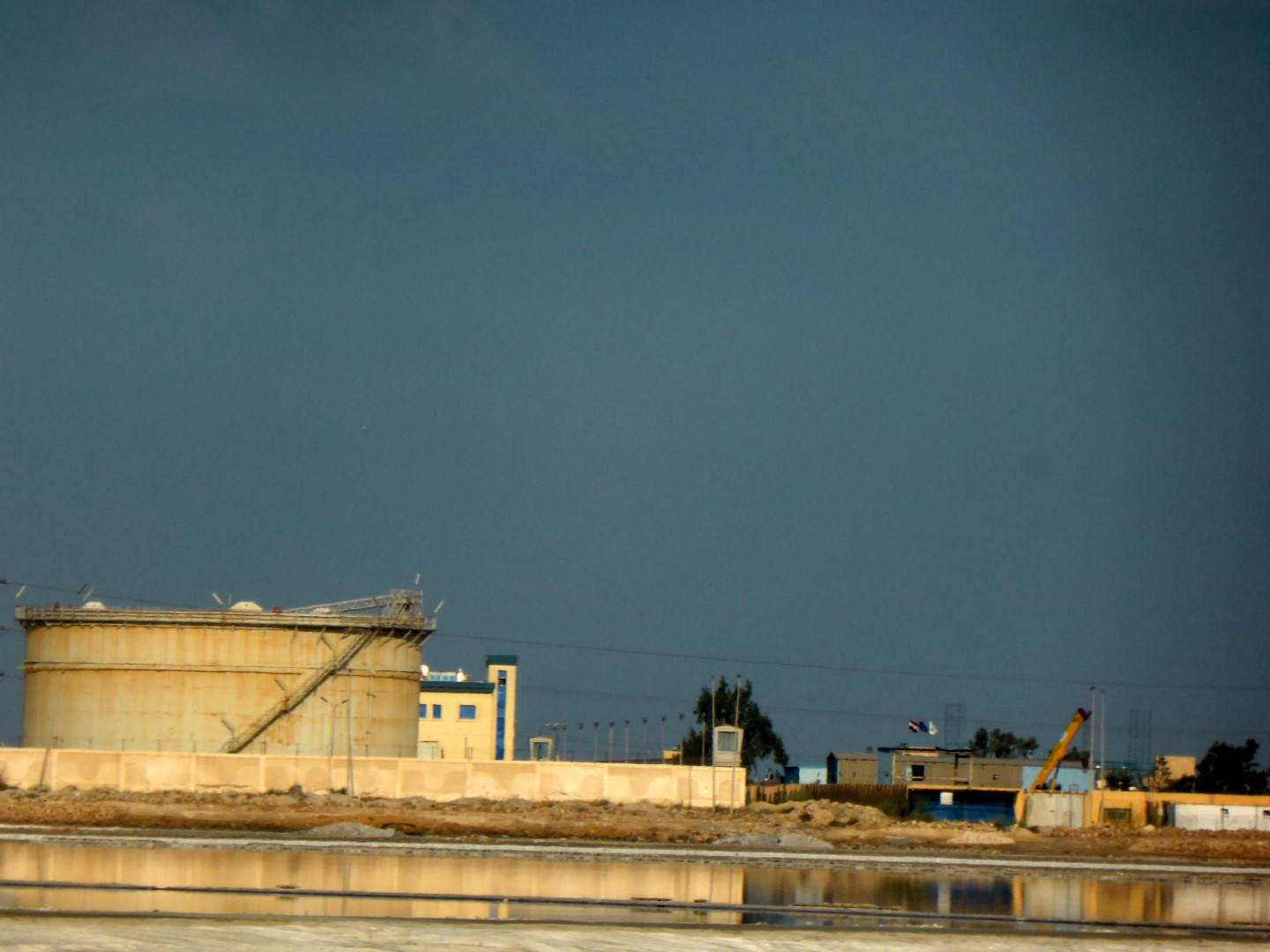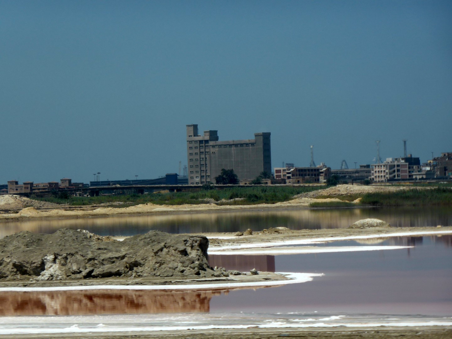 Es ist immer wieder faszinierend, wie sich im Lauf der Zeit die Farbe des Wasser verändert. Am Beginn noch gewohnt grünlich, dann mit zunehmender Konzentration des Salzes, von rosa bis violett schimmernd. Salzinseln entstehen und bilden im Laufe der Zeit eine einzige, mit Rissen durchzogene, weiße-graue Fläche. Gerade im besonderen Licht des Nachmittags, im Hintergrund die Industrieanlagen, Gasabfackeltürmen und der Skyline von Alexandria, die perfekte Kulisse für einen Futurfilm.