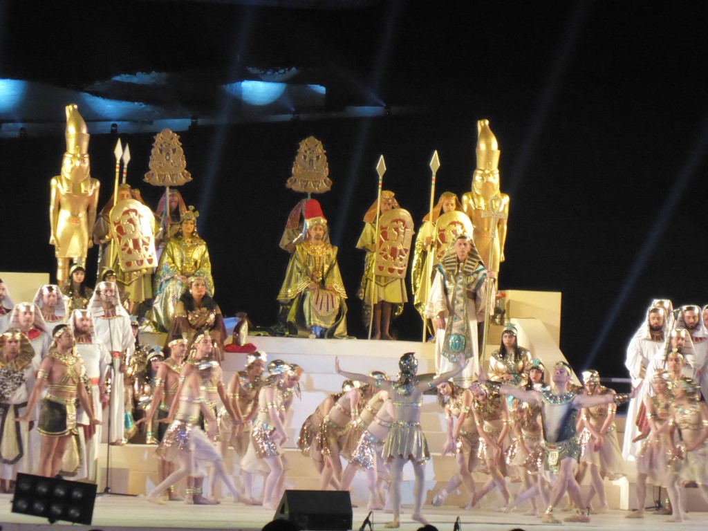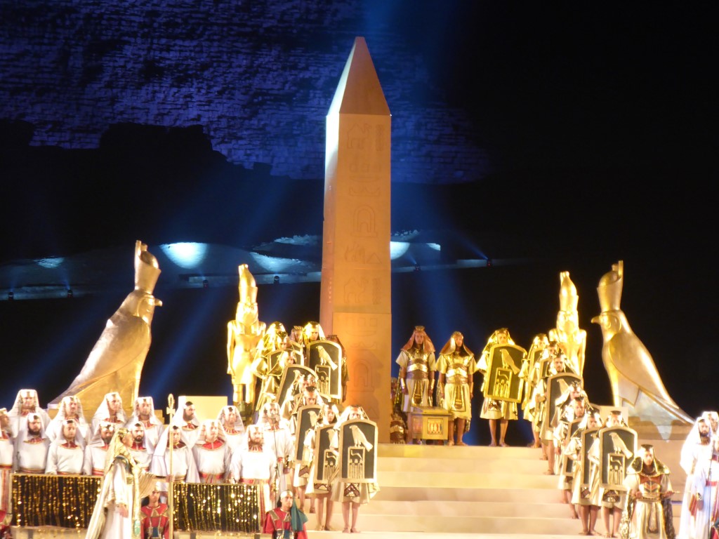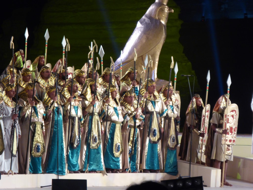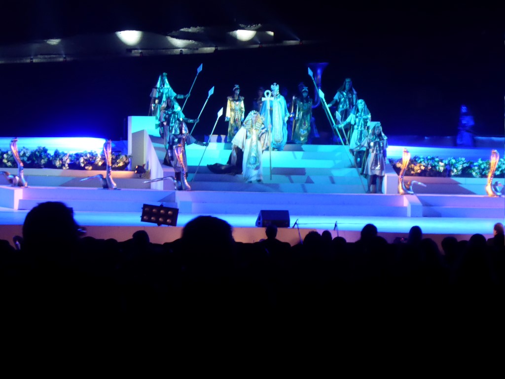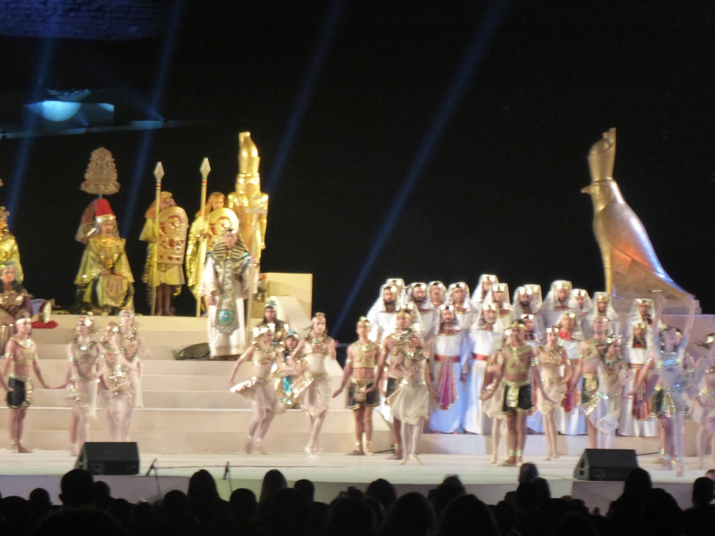 Endlich fing die Oper an. Der Tontechniker war etwas schwerhörig, zumindest hat er bis zum Ende der Veranstaltung es nicht wirklich hinbekommen, alle Mikrofone so zu verbinden, dass Jeder betroffen war und man Jedem auch verstand. Zumindest besserte er sich bis zum Ende der Veranstaltung. Die Aida selbst sang etwas komisch, doch alle anderen Sänger waren sehr gut und die kolossale Stimmung mit der beleuchteten Sphinx und den Pyramiden ist schon wirklich toll gewesen. Nächstes Jahr soll es wieder stattfinden. Vielleicht ja auch mit euch?