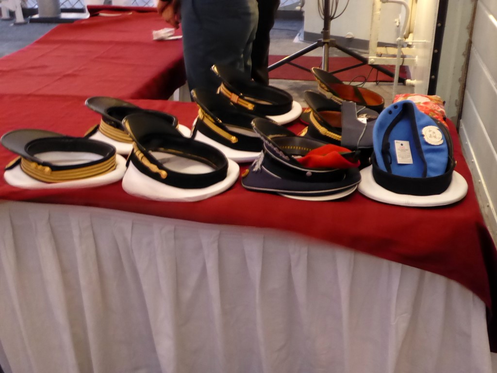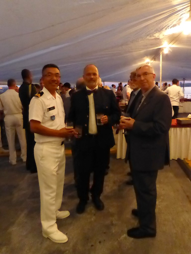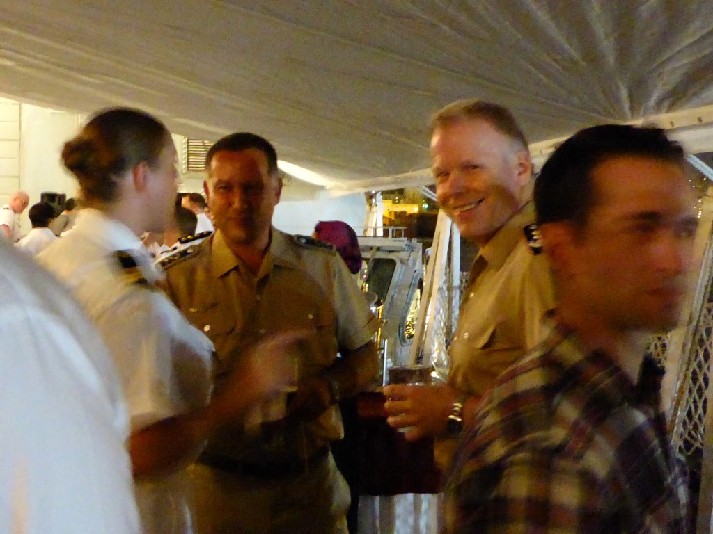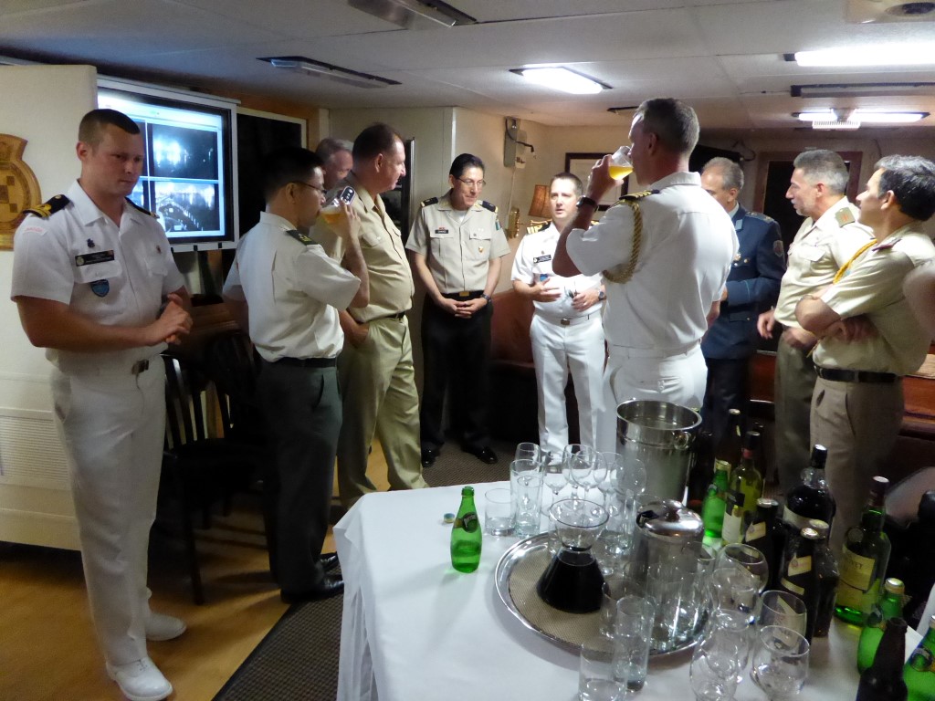 Wir fuhren mit dem Botschaftsauto vor. Bereits mehrere warteten auf dem Platz vor dem Schiff und beim Betreten des Schiffes wurden wir vom Kapitän, dem kanadischen Militärattaché und noch weiteren Menschen begrüßt. Alle Eingeladenen vom Militär kamen natürlich in Uniform und gaben als Erstes ihre Hüte ab. Anschließend wurde man sofort mit den nötigen Getränken versorgt und übte sich im internationalen Austausch.
