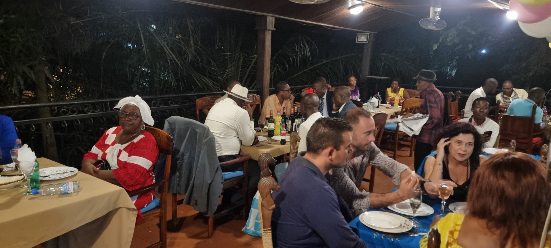 Als dann so gegen 17 Uhr die ersten Gäste kamen (es war ja kamerunisches 15 Uhr) war die Gastgeberin noch nicht da, was aber die Gäste nicht davon abhielt zahlreich herbei zu strömen. Am Ende waren es dann weit über 100. Blos gut, dass die Küche so etwas schon vorhergesehen hatte und mehr in die Töpfe gelegt hatte.