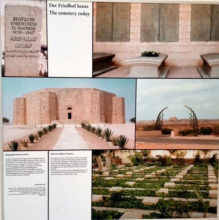 In den Kämpfen 1942 bei El Alamein fielen etwa 4500 Angehörige des deutschen Afrikakorps. Sie wurden, soweit es die Frontlage erlaubte, von ihren Kameraden bestattet. Zwischen 1943 und 1947 überführten britische Umbettungskommandos rund 3000 deutsche und etwa 1800 italienische Gefallene auf einen Platz nahe der Bahnstation des Ortes. Wegen der Wüstenverhältnisse entstand 1959 die Kriegsgräberstätte El Alamein als ummauerte Gedenkstätte für 4213 deutsche Tote. Neben diesem Friedhof der früheren Achsenmächte gibt es auch den Commonwealth-Kriegsfriedhof, auf dem 7500 Soldaten der Alliierten begraben liegen, sowie einen italienischen Soldatenfriedhof mit 5200 Gefallenen.
