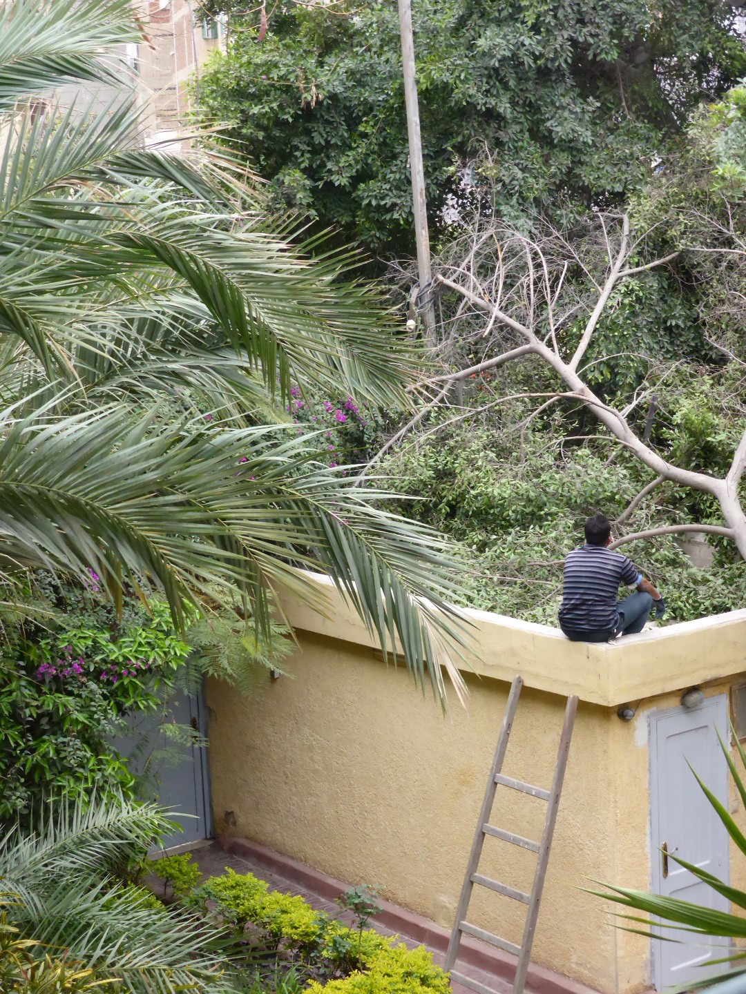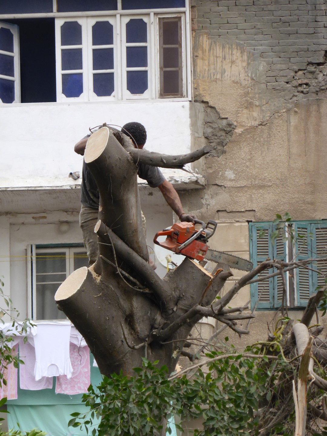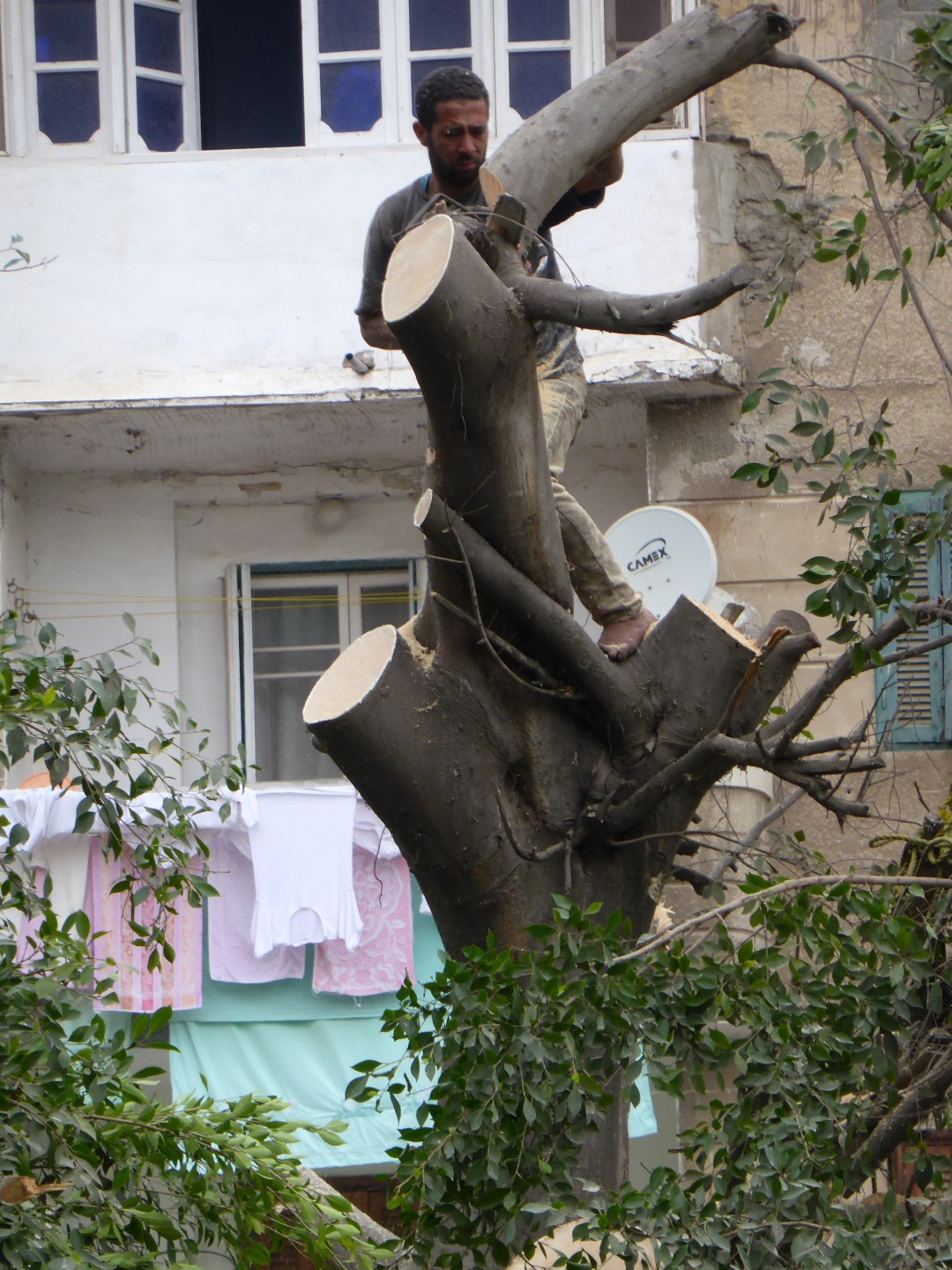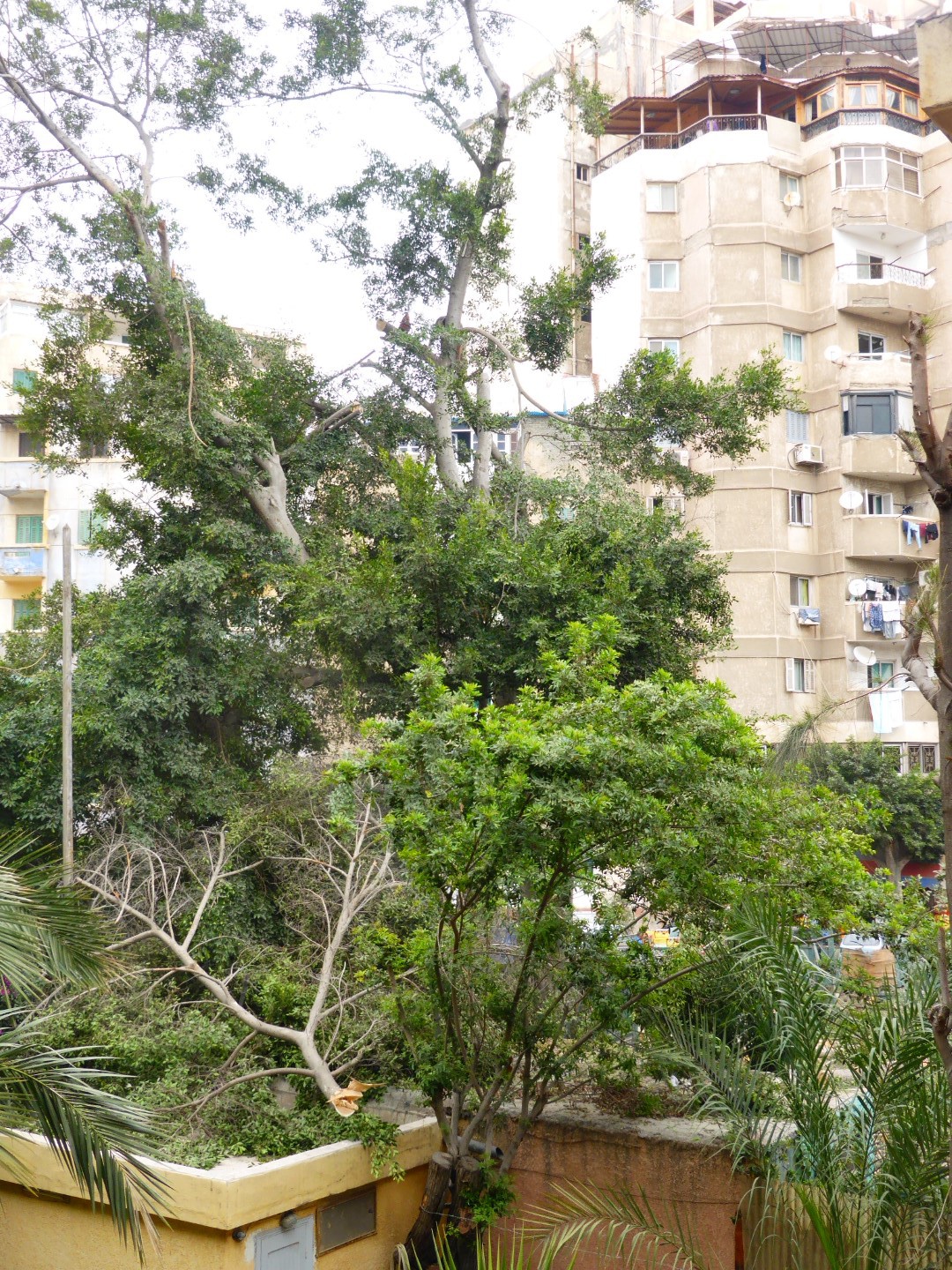 Vor kurzem wurde das Nachbarhaus auf der anderen Seite von unserem Grundstück verkauft, gleich darauf rückte das Baumfällkomando an und innerhalb von 2 Tagen waren sämtlichen uralten Riesenbäume gefällt. Es ist wirklich ein Riesenjammer!! Uns graut schon vor dem Tag, an dem die Abbruchmannschaft mit der Arbeit beginnt. Dann verliert der alte Stadtteil Wabour el Maya in Alexandria wieder ein Stück alte Baugeschichte, verbunden mit Lebensqualität durch ein bisschen letztes Grün, Licht, Luft, Platz für Vögel und wird durch ein unansehnliches Hochhaus ersetzt. Schade!