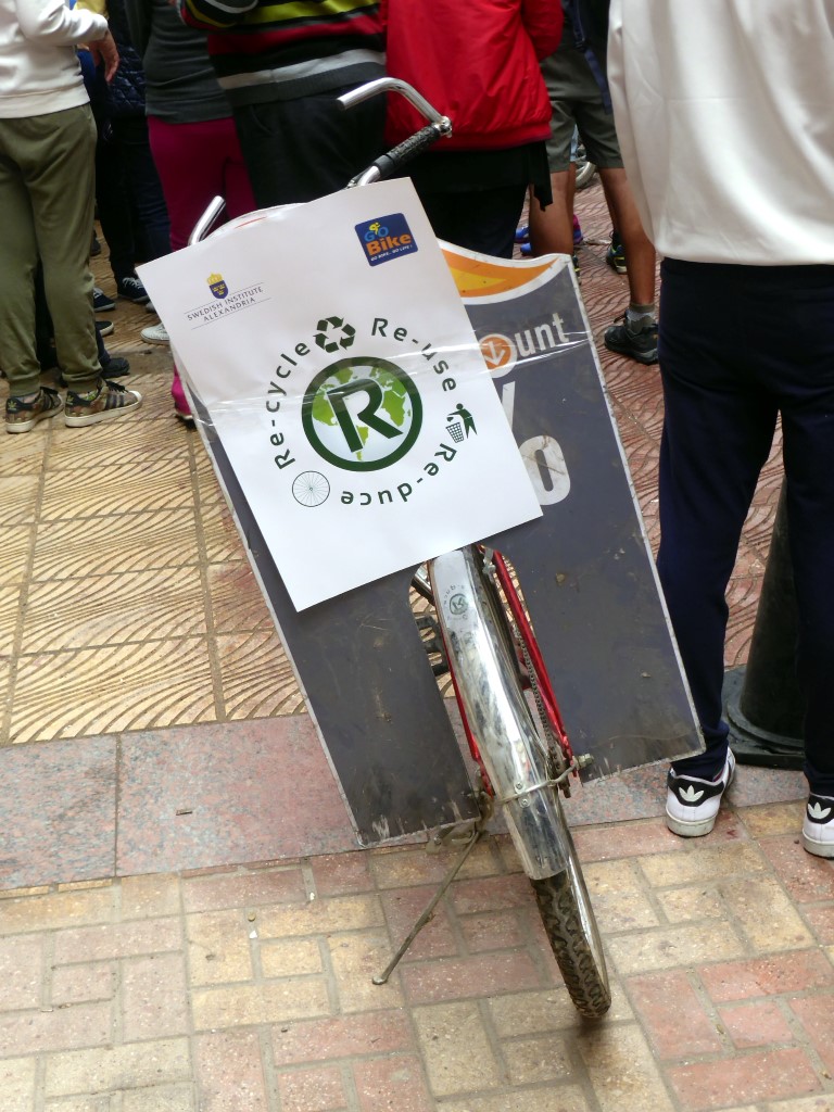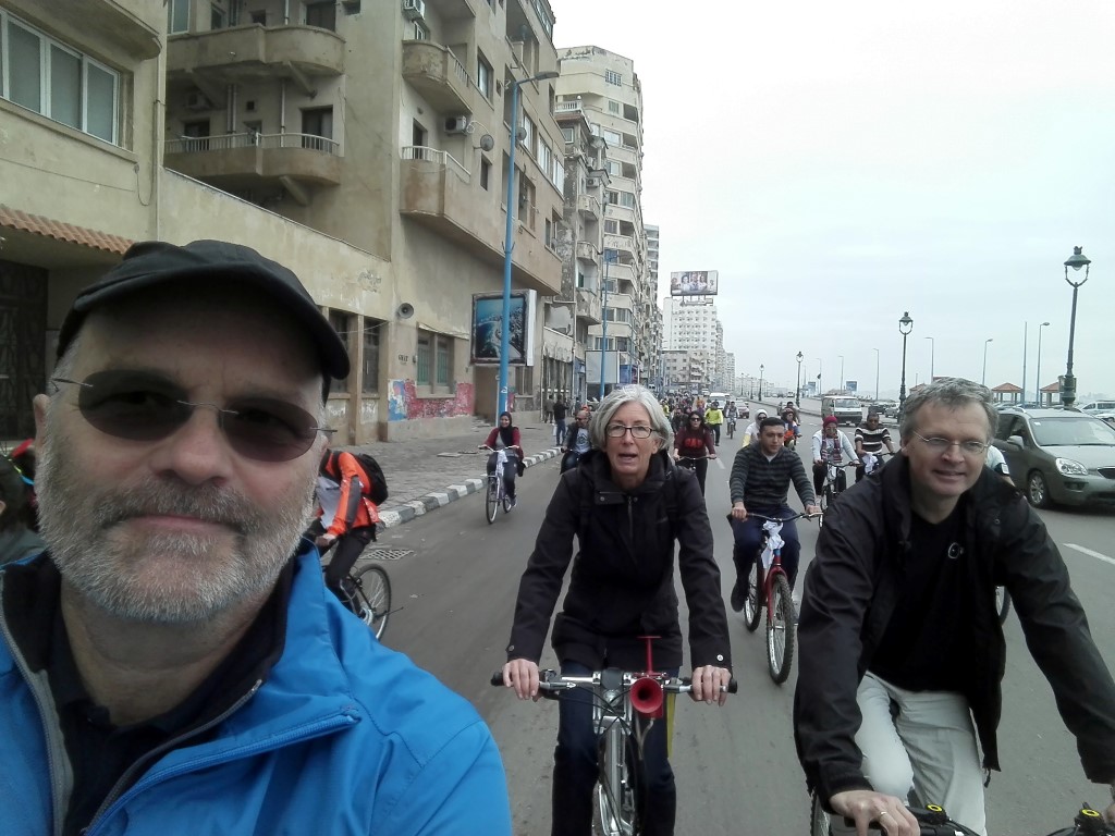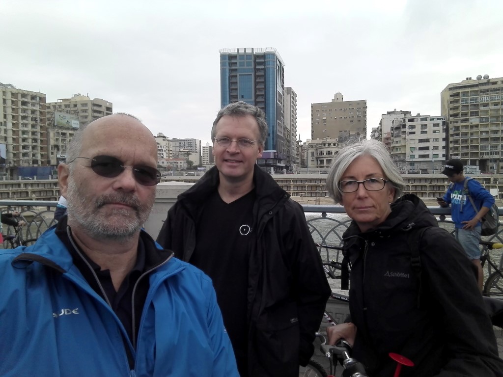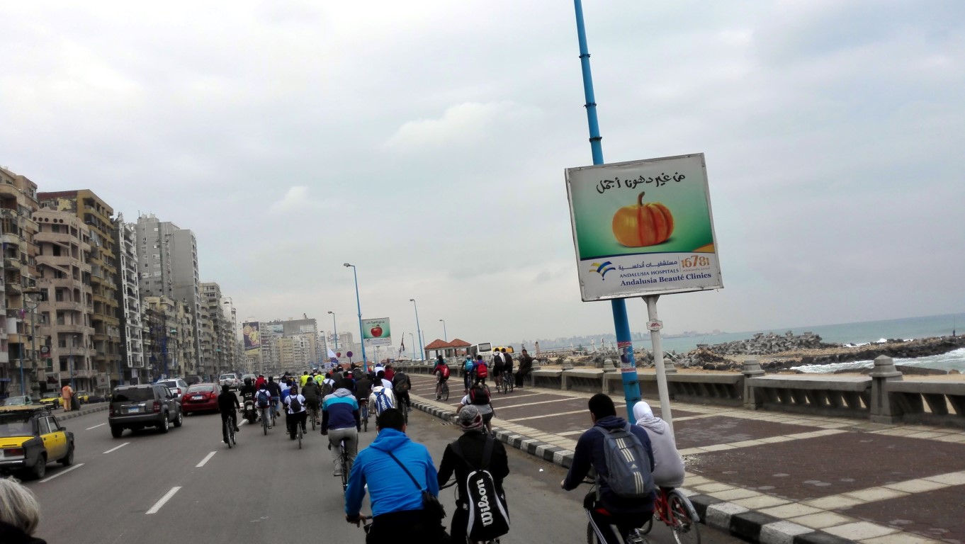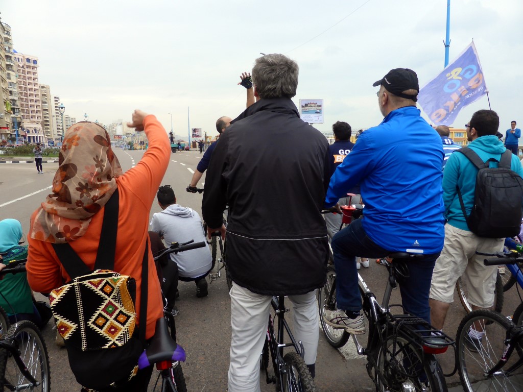 Am Freitag morgen haben wir an einer Fahrradtour teilgenommen, die anlässlich des Klimagipfels an umweltbewusstes Verhalten gemahnen soll „Facing the climate“. Es dürften wohl etwa 300 Personen gewesen sein, die auf der Stadtautobahn – der „Corniche“ – am Meeresufer entlang fuhren. Organisiert wurde das Ganze vom Schwedischen Institut, zusammen mit einer ägyptschen Fahrradvereinigung, einigen Umweltaktivisten und einer kleinen Frauengruppe.