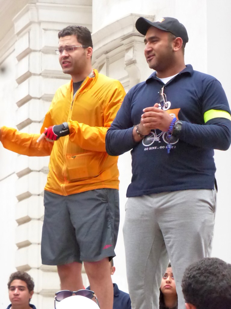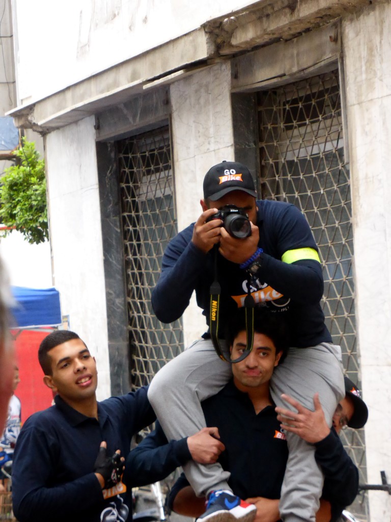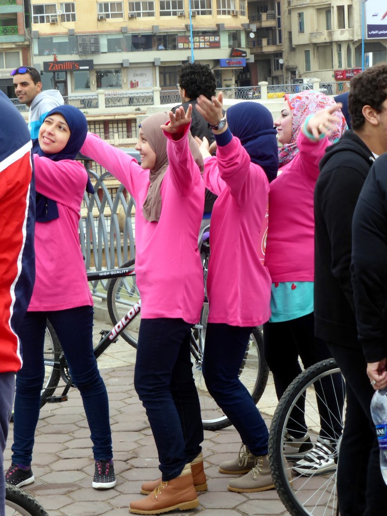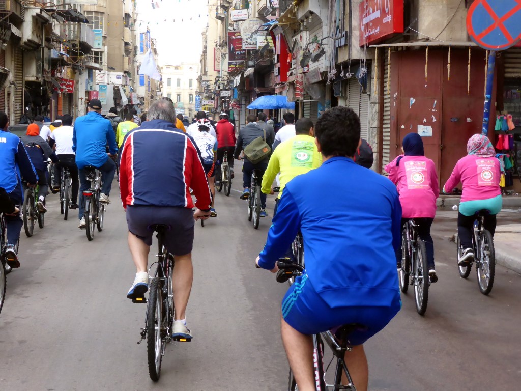 Umso spannender war es denn auch, als sich der gesamte Pulk dann wie ein großer langgezogener Lindwurm die befahrene Straße entlangwälzte. Aufgeregtes Gekreische und Geschnatter waren ständiger Begleiter bei der Fahrt. Die Ägypter genossen die unübliche Ausfahrt sehr und wackelten auf ihren (häufig viel zu niedrigen) Rädern ungeübt und unsicher die Piste entlang. Es fehlte auch nicht an kleinen Auffahrunfällen und vereinzelten Stürzen. Zum Glück ohne größere Blessuren. Mindestens ebenso sehr genossen die Zuschauer auf Bürgersteig und in den vorbeifahrenden Autos das ungewöhnliche Bild. Manch ein Handy wurde lachend gezückt und Erinnerungsfotos geschossen.