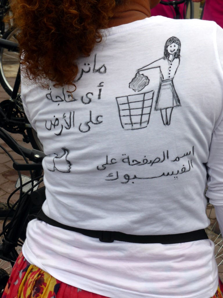 Auf ihrem T-Shirt hat sie einen Aufruf aufnotiert, dass Müll in den Abfalleimer geworfen werden soll.