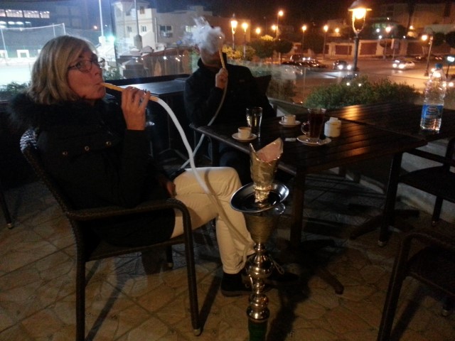 Karin und ich sind dann abends mit einem Freund in ein nahegelegenes Restaurant gegangen. Ich bin extra vorher noch hin um einen Tisch zu reservieren – war aber eigentlich nicht notwendig. Es gab auch später mehr als ausreichend Platz. Es war ein neu eröffnetes türkisches Restaurant am Wabour El Maja – sehr zu empfehlen. Also schön gegessen und zum Abschluss gab es dann noch die Shisha – also die Wasserpfeife mit Kaffee auf der Terasse. Auch wenn es dann schon etwas kühl war, konnte man gut dort sitzen.