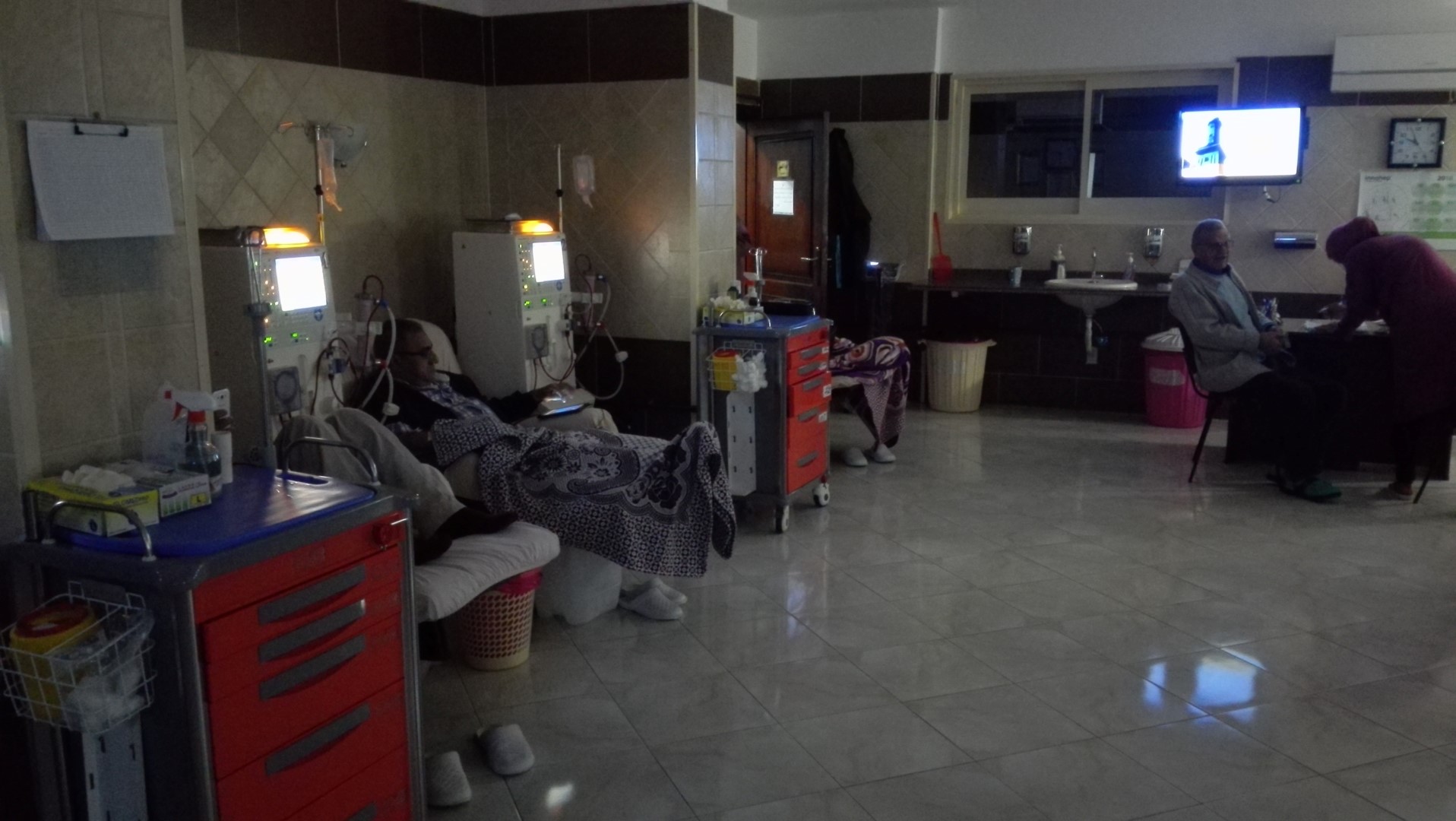Eine solche habe ich besucht. Abdou unser Vermieter der Ferienwohnung am Meer betreibt mit ein paar anderen bereits in Rente befindlichen Ärzten eine Dialyseklinik. Mitten in einem Wohngebiet gibt es eine kleine Klinik. Schon am Eingang merkt man, dass man in einer anderen Welt ist. Das Betreten mit Straßenschuhen ist verboten. Jeder muss klinikeigene Schuhe anziehen. In den Toiletten gibt es neben Seife auch Desinfektionsmittel für die Hände. Es riecht sehr sauber und ganz im Gegensatz zum sonstigen Ägypten ist es in den Räumen ganz leise. 12 Blutreinigungsmaschinen, die aus Europa kommen brummen und daneben sitzen 12 Menschen. Normalerweise müssten in so einer Einrichtung nun 4 Krankenschwestern arbeiten, doch das Geld langt nur für 2. Weitere Helfer sind vor Ort und versuchen das Leben am Laufen zu halten.